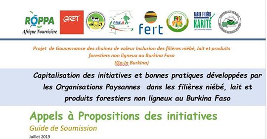 Dans le cadre de la mise en œuvre du programme « Gouvernance des chaines de valeur et Inclusion des filières niébé, lait, et produits forestiers non ligneux au Burkina» ; le consortium GRET, APESS, APME2A, FERT, FIAB, TFK, TFL, et le ROPPA lance un appel à projet dénommé « Capitalisation des initiatives et bonnes pratiques développées par les Organisations Paysannes dans les filières niébé, lait et produits forestiers non ligneux au Burkina Faso ». Date limite 09 septembre 2019.