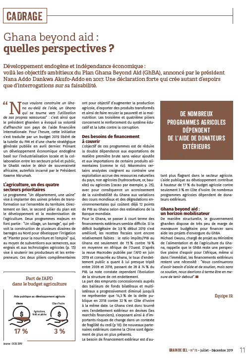 Ghana beyond aid : un horizon mobilisateur. De manière structurelle, le gouvernement ghanéen dispose de très peu de marge de manoeuvre budgétaire pour financer sans aide les projets d’envergure du GhBA. Michael Owusu, chargé de projet au Ministère de l’alimentation et de l’agriculture du Ghana, rappelle que le GhBA reste une perspective pleine d’espoir pour l’Afrique, même si dans l’immédiat, les financements extérieurs restent une nécessité : “Nous continuerons d’avoir besoin d’aide et de soutien, mais sans ce soutien, nous devrions à terme être en mesure de tenir debout”.