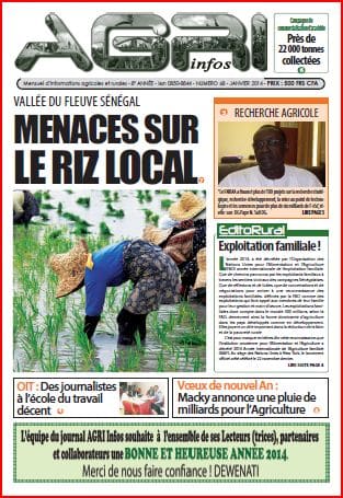 Agri-Infos est un mensuel sénégalais d’informations agricoles et rurales. L’éditorial du numéro de janvier 2014 est consacré à l’agriculture familiale et aux actions menées par le CNCR pour mieux cerner les contours et l’importance de ce mode de production. La revue contient également une interview avec le Dr Pape Sall, Directeur général du Fonds national de recherches agricoles et agro-alimentaires (FNRAA) sur la contribution de sa structure dans la politique de financement de la recherche agricole et agroalimentaire de l’État. Un autre article explique pourquoi le faible remboursement du crédit agricole menace la filière riz.