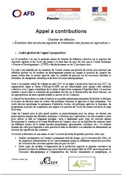 Pour chaque contribution, une note d’intention d’une page est d’abord à envoyer avant le 15 février 2018, à l’adresse chantierjeunesetfoncier@agter.org.