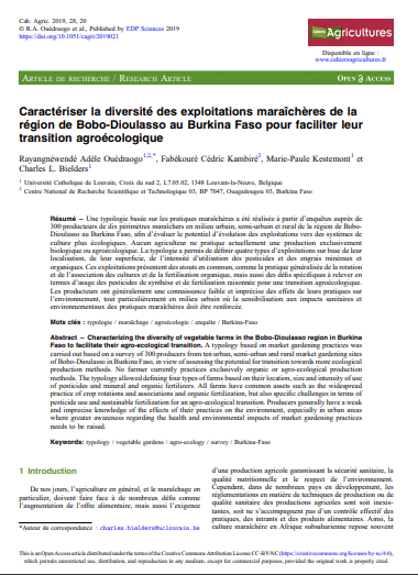 Une typologie basée sur les pratiques maraîchères a été réalisée à partir d’enquêtes auprès de 300 producteurs de dix périmètres maraîchers en milieu urbain, semi-urbain et rural de la région de Bobo-Dioulasso au Burkina Faso, afin d’évaluer le potentiel d’évolution des exploitations vers des systèmes de culture plus écologiques.