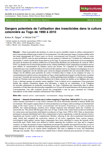 Au Togo, l’utilisation des insecticides dans la culture cotonnière a évolué dans une direction plus compatible avec le souci de la santé humaine et de la préservation de l’environnement. Une telle évolution devrait être extrapolable à tous les pays cotonniers de l’Afrique francophone où des études similaires mériteraient d’être réalisées.