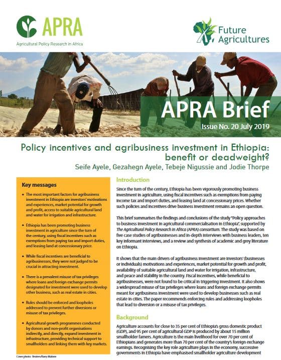 This brief summarises the findings and conclusions of the APRA study ‘Policy approaches to business investment in agricultural commercialisation in Ethiopia’. It looks at the main drivers of agribusiness investment, usefulness of the tax privilege system, the effectiveness of agricultural growth programmes led by donors and non-profit organisations. The brief also addresses whether or not the enforcement of rules and closure of loopholes can prevent the misuse of tax privileges.