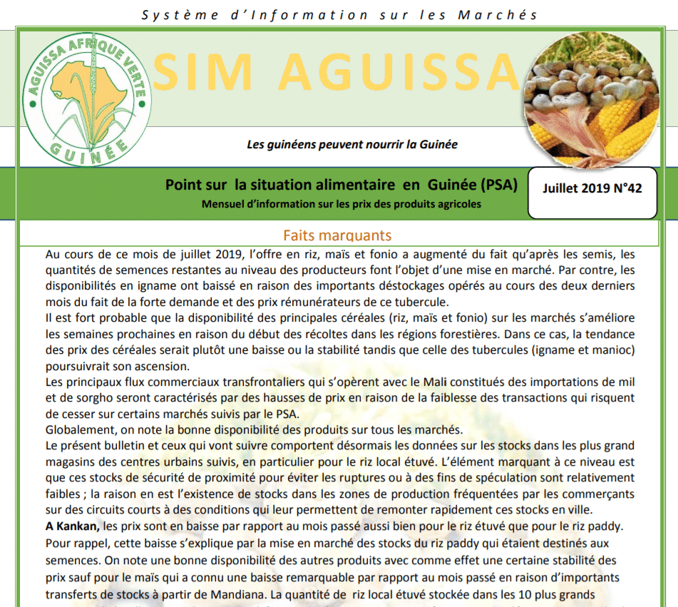 Le bulletin PSA-AGUISSA (Point Sur la Sécurité alimentaire) est un mensuel qui fournit des informations sur les prix des produits agricoles en Guinée. Dans son numéro 42, il ressort qu’au cours du mois de juillet 2019, l’offre en riz, maïs et fonio a augmenté du fait qu’après les semis, les quantités de semences restantes au niveau des producteurs font l’objet d’une mise en marché. Par contre, les disponibilités en igname ont baissé en raison des importants déstockages opérés au cours des deux derniers mois du fait de la forte demande et des prix rémunérateurs de ce tubercule.