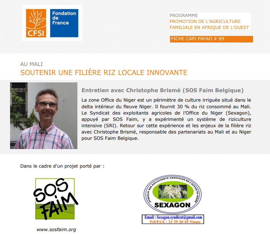 La zone Office du Niger est un périmètre de culture irriguée situé dans le delta intérieur du fleuve Niger. Il fournit 30 % du riz consommé au Mali. Le Syndicat des exploitants agricoles de l’Office du Niger (Sexagon), appuyé par SOS Faim, y a expérimenté un système de riziculture intensive (SRI). Retour sur cette expérience et les enjeux de la filière riz avec Christophe Brismé, responsable des partenariats au Mali et au Niger pour SOS Faim Belgique.