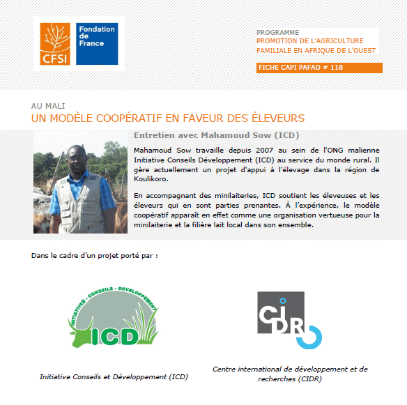 Mahamoud Sow travaille depuis 2007 au sein de l’ONG malienne Initiative Conseils Développement (ICD) au service du monde rural. Il gère actuellement un projet d’appui à l’élevage dans la région de Koulikoro. En accompagnant des mini laiteries, ICD soutient les éleveuses et les éleveurs qui en sont parties prenantes. À l’expérience, le modèle coopératif apparaît en effet comme une organisation vertueuse pour la mini laiterie et la filière lait local dans son ensemble.