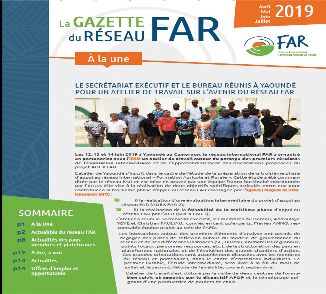 La Gazette du réseau FAR d’avril- juillet 2019 a mis à sa Une l’atelier de travail de Yaoundé de juin dernier sur l’avenir du réseau FAR. La Gazette traite également des activités du réseau FAR (une délégation de l’AFD en immersion à l’IRC, un atelier avec FERT et l’IFOCAP sur l’étude d’impact économique de la formation et de l’insertion professionnelle agricole à Madagascar, le futur projet d’amélioration de l’accès aux services vétérinaires en Afrique francophone, etc.) et de l’actualité des pays membres et plateformes. A signaler aussi les rubriques A lire, à voir qui mentionnent les dernières publications d’Inter-réseaux sur le conseil agricole.