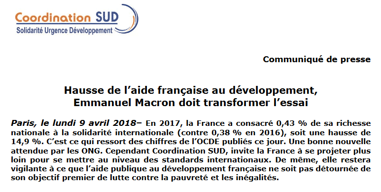 En 2017, la France a consacré 0,43 % de sa richesse nationale à la solidarité internationale (contre 0,38 % en 2016), soit une hausse de 14,9 %. C’est ce qui ressort des chiffres de l’OCDE publiés ce jour. Une bonne nouvelle attendue par les ONG. Dans ce communiqué de presse, Coordination SUD invite la France à se projeter plus loin pour se mettre au niveau des standards internationaux. De même, elle restera vigilante à ce que l’aide publique au développement française ne soit pas détournée de son objectif premier de lutte contre la pauvreté et les inégalités.