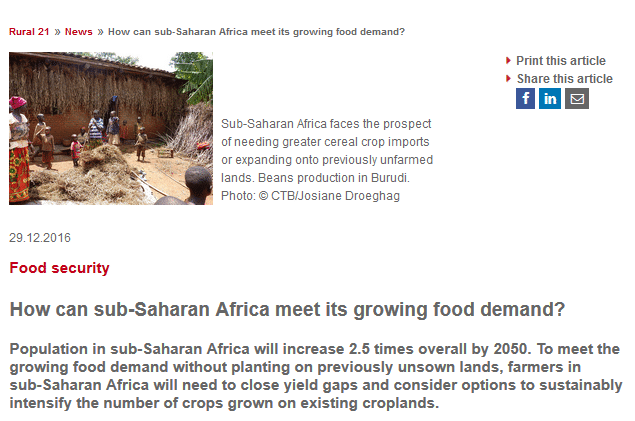 Population in sub-Saharan Africa will increase 2.5 times overall by 2050. To meet the growing food demand without planting on previously unsown lands, farmers in sub-Saharan Africa will need to close yield gaps and consider options to sustainably intensify the number of crops grown on existing croplands. -# Read the summary and the full paper:
