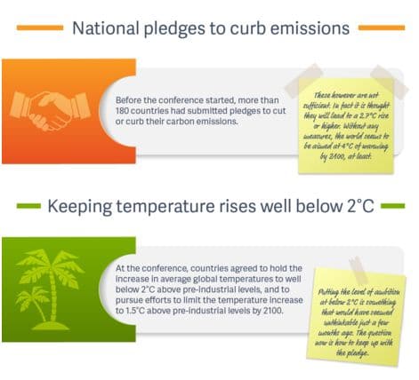 On 12 December 2015, world governments concluded a historic international agreement to fight global warming at the UN Climate Change Conference (COP21) in Paris. Almost 200 nations agreed to a deal to cap global warming at “well below” two degrees above pre-industrial levels, with a reference to a lower, long-term 1.5 degree target in the text.