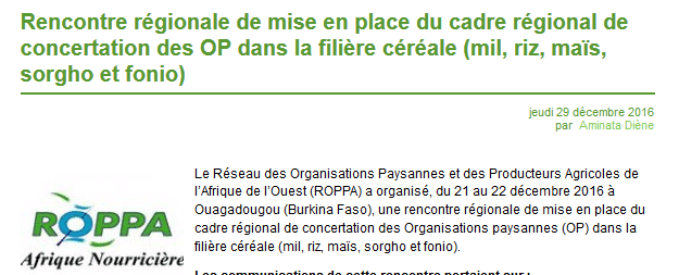 Prévue du 05 au 09 janvier 2017, la quatrième (4ème) session de l’Université Paysanne du Réseau des Organisations Paysannes et des Producteurs de l’Afrique de l’Ouest (ROPPA) se tiendra dans les locaux de la Fédération des Organisations Non-Gouvernementales du Sénégal (FONGS-Action paysanne) à Thiès. Etant cadre de référence pour la formation des Organisations Paysannes (OP), l’Université Paysanne du ROPPA met en œuvre des outils pélagiques appropriés pour des besoins exprimés dans les domaines prioritaires du plan stratégique du ROPPA (fournitures de services économiques, renforcement de capacités techniques du Secrétariat exécutif et des plateformes, renforcement du plaidoyer). -# Lire le communiqué: -# Lire le résumé de la première journée: -# Lire le résumé des deuxième et troisième journées: