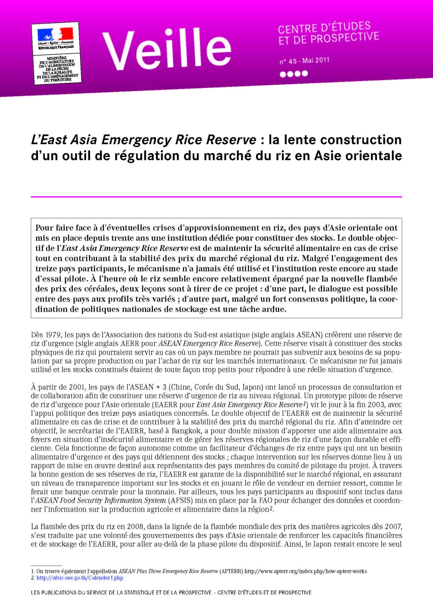 Pour faire face à d’éventuelles crises d’approvisionnement en riz, des pays d’Asie orientale ont mis en place depuis trente ans une institution dédiée pour constituer des stocks. Le double objectif de l’East Asia Emergency Rice Reserve est de maintenir la sécurité alimentaire en cas de crise tout en contribuant à la stabilité des prix du marché régional du riz. Malgré l’engagement des treize pays participants, le mécanisme n’a jamais été utilisé et l’institution reste encore au stade d’essai pilote. À l’heure où le riz semble encore relativement épargné par la nouvelle flambée des prix des céréales, deux leçons sont à tirer de ce projet : d’une part, le dialogue est possible entre des pays aux profils très variés ; d’autre part, malgré un fort consensus politique, la coordination de politiques nationales de stockage est une tâche ardue.