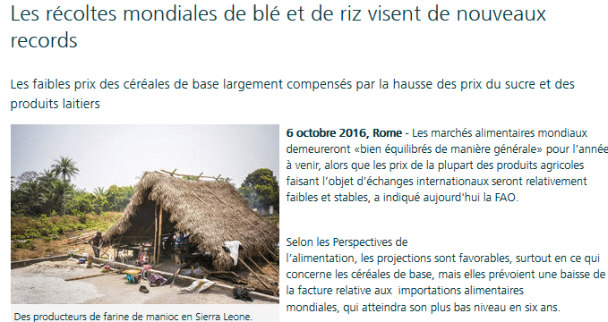 Les marchés alimentaires mondiaux demeureront «bien équilibrés de manière générale» pour l’année à venir, alors que les prix de la plupart des produits agricoles faisant l’objet d’échanges internationaux seront relativement faibles et stables, a indiqué aujourd’hui la FAO. Les prévisions record de production mondiale pour les récoltes de blé et de riz cette année, combinées à la relance de la production de maïs, contribuent à maintenir des stocks abondants et des prix relativement faibles. La production mondiale de céréales pour 2016 devrait augmenter pour atteindre les 2 569 millions de tonnes, soit une hausse d’1,5 pour cent par rapport à l’année précédente et suffisamment pour accroitre les réserves existantes.