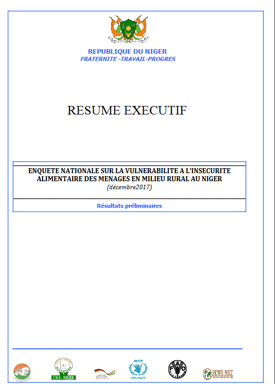 Le Gouvernement du Niger, à travers la Cellule de Coordination du Système d’Alerte Précoce (CC/SAP) et l’Institut National de la Statistique (INS), a organisé une enquête auprès des ménages en milieu rural pour mieux appréhender la situation de vulnérabilité à l’insécurité alimentaire des populations entre décembre 2017. Cette note présentent les résultats de l’enquête. Il en ressort qu’en milieu rural, 484 767 personnes soit 2,6% de cette population, sont en insécurité alimentaire sévère et 2 192 821 personnes, soit 11,9% en insécurité alimentaire modérée. Au total, 2 677 588 personnes soit 14,5% de la population sont en insécurité alimentaire. Il faut également noter que 5 978 657personnes soit 32,4% sont classées « à risque », c’est-à-dire en sécurité alimentaire fragile. Enfin, les personnes en sécurité alimentaire sont au nombre de 9 802 919 soit 53,1% de la population rurale.