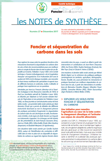 Une rencontre a été organisée en décembre 2017 pour explorer les nexus entre les questions foncières et les mécanismes favorisant la séquestration du carbone dans les sols, et faire des recommandations pour une meilleure prise en compte du foncier dans la mise en place de ces dispositifs sur la durée.