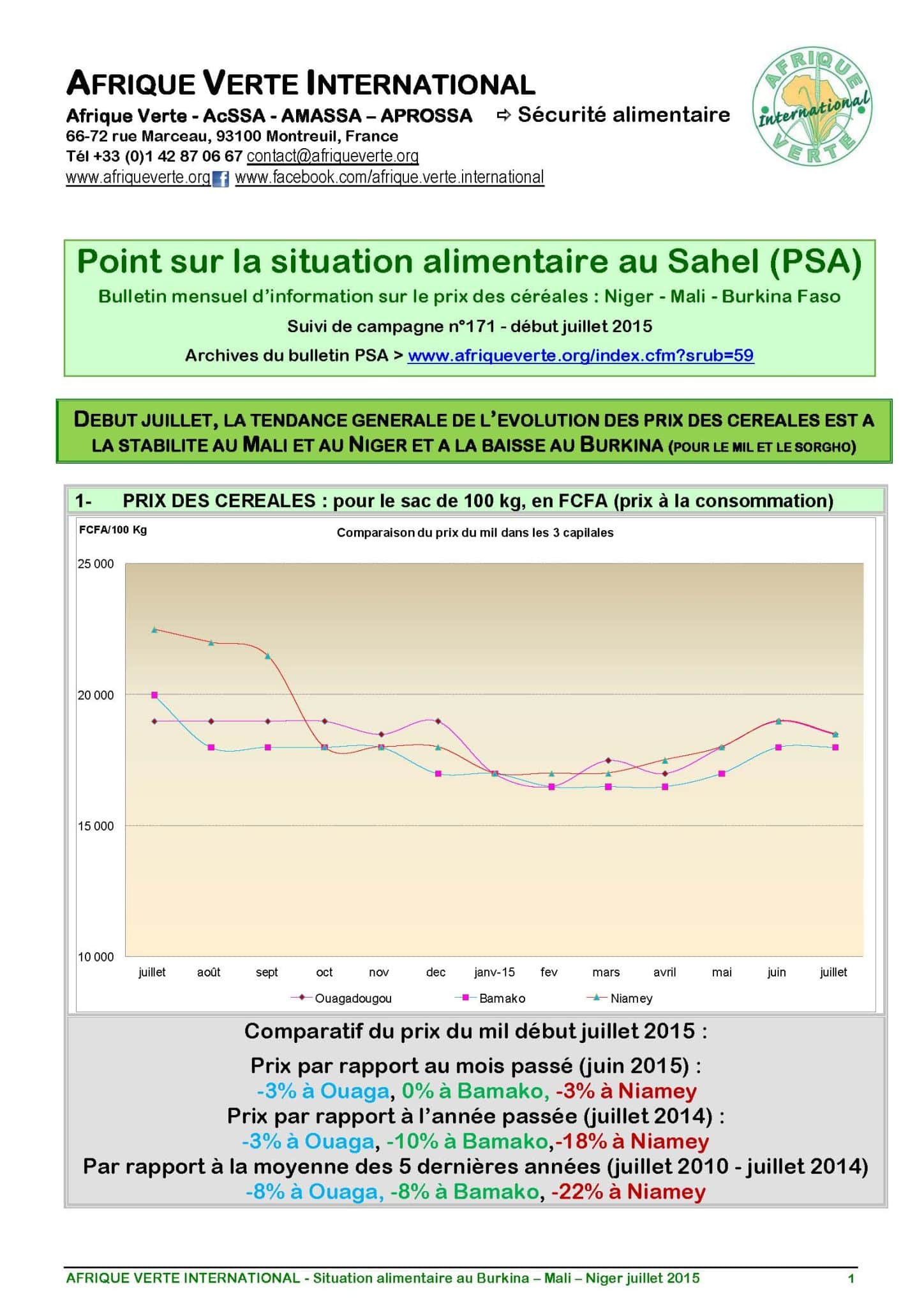 Trouvez ci-joint le numéro 171 (juillet 2015) du Point sur la Sécurité Alimentaire au Sahel, notre mensuel d’information sur le prix des céréales au Niger, Mali et Burkina Faso.