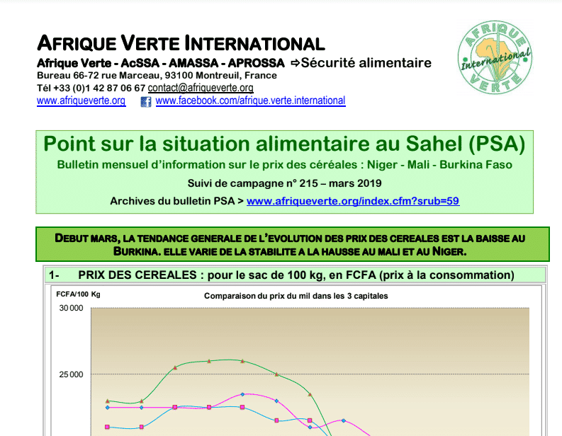 Le bulletin d’Afrique verte sur la Sécurité Alimentaire numéro 215 du mois de mars 2019 est disponible. Début mars, la tendance générale de l’évolution des prix des céréales est la baisse au Burkina. Elle varie de la stabilité à la hausse au Mali et au Niger.