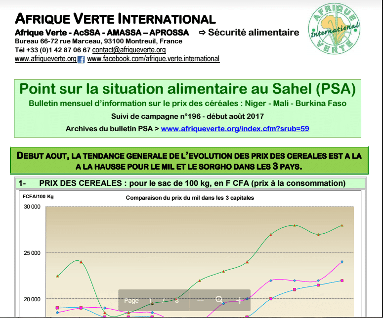 Le bulletin d’Afrique verte du mois d’Août sur l’évolution des prix des céréales au Burkina Faso, au Mali et au Niger est disponible ! En début Août, la tendance générale de l’évolution des prix des céréales est à la hausse pour le mil et le sorgho dans ces 3 pays.