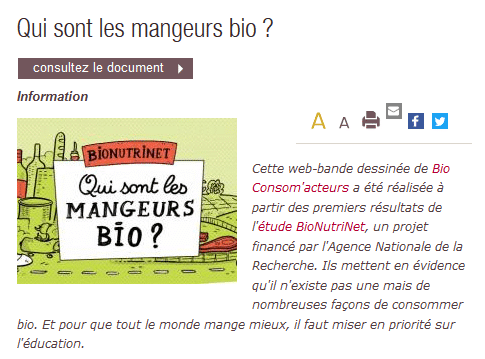 Cette web-bande dessinée de Bio Consom’acteurs a été réalisée à partir des premiers résultats de l’étude BioNutriNet, un projet financé par l’Agence Nationale de la Recherche. Ils mettent en évidence qu’il n’existe pas une mais de nombreuses façons de consommer bio. Et pour que tout le monde mange mieux, il faut miser en priorité sur l’éducation. -# Pour consulter l’article et la web-BD: