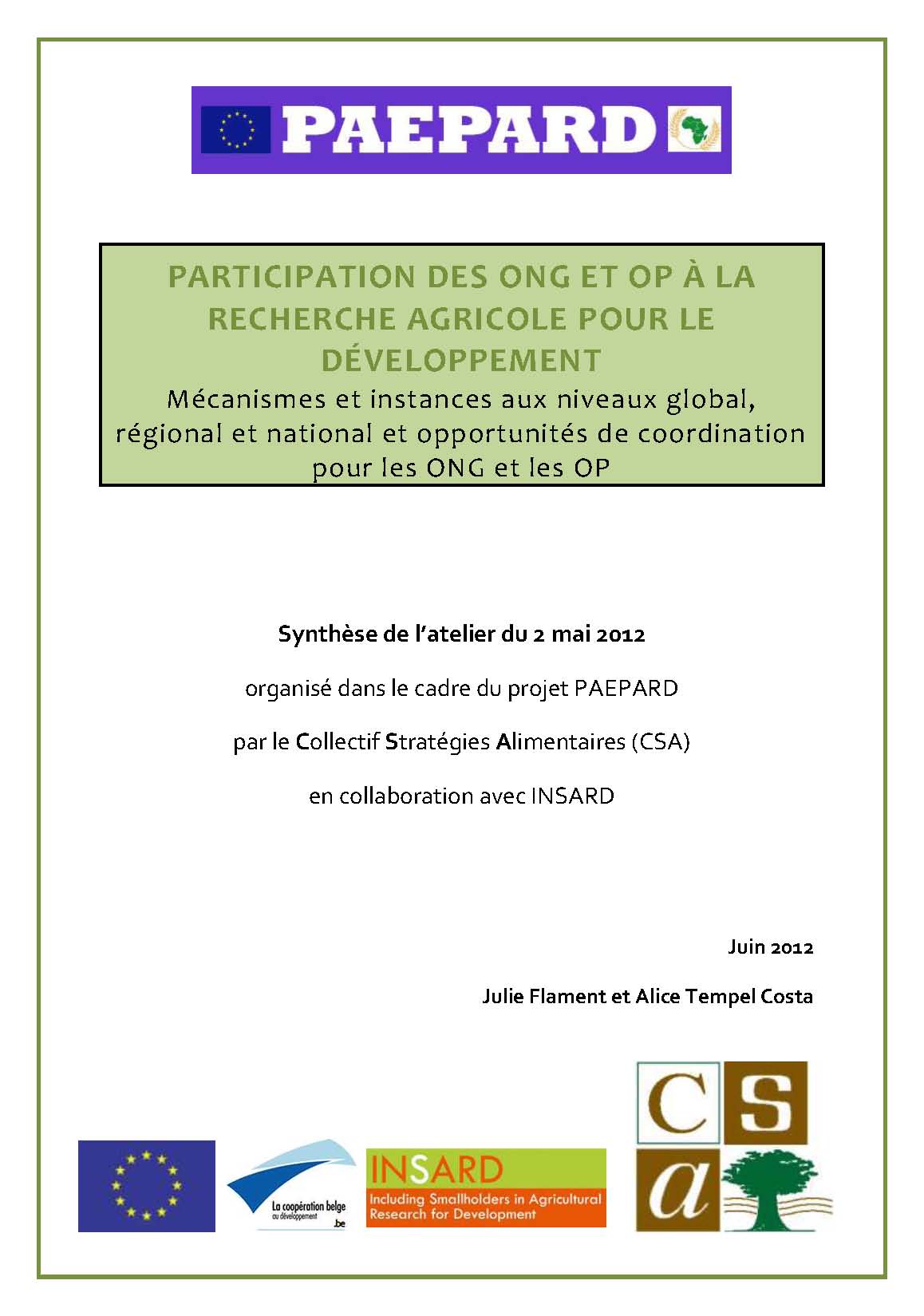 Ce rapport a pour objectif de capitaliser les discussions menées pendant l’atelier « Participation des ONG et OP à la recherche agricole pour le développement : Mécanismes et instances aux niveaux global, régional et national et opportunités de coordination pour les ONG et les OP » organisé le 2 mai 2012 à Bruxelles par le CSA dans le cadre du programme PAEPARD, avec la collaboration du programme INSARD.
