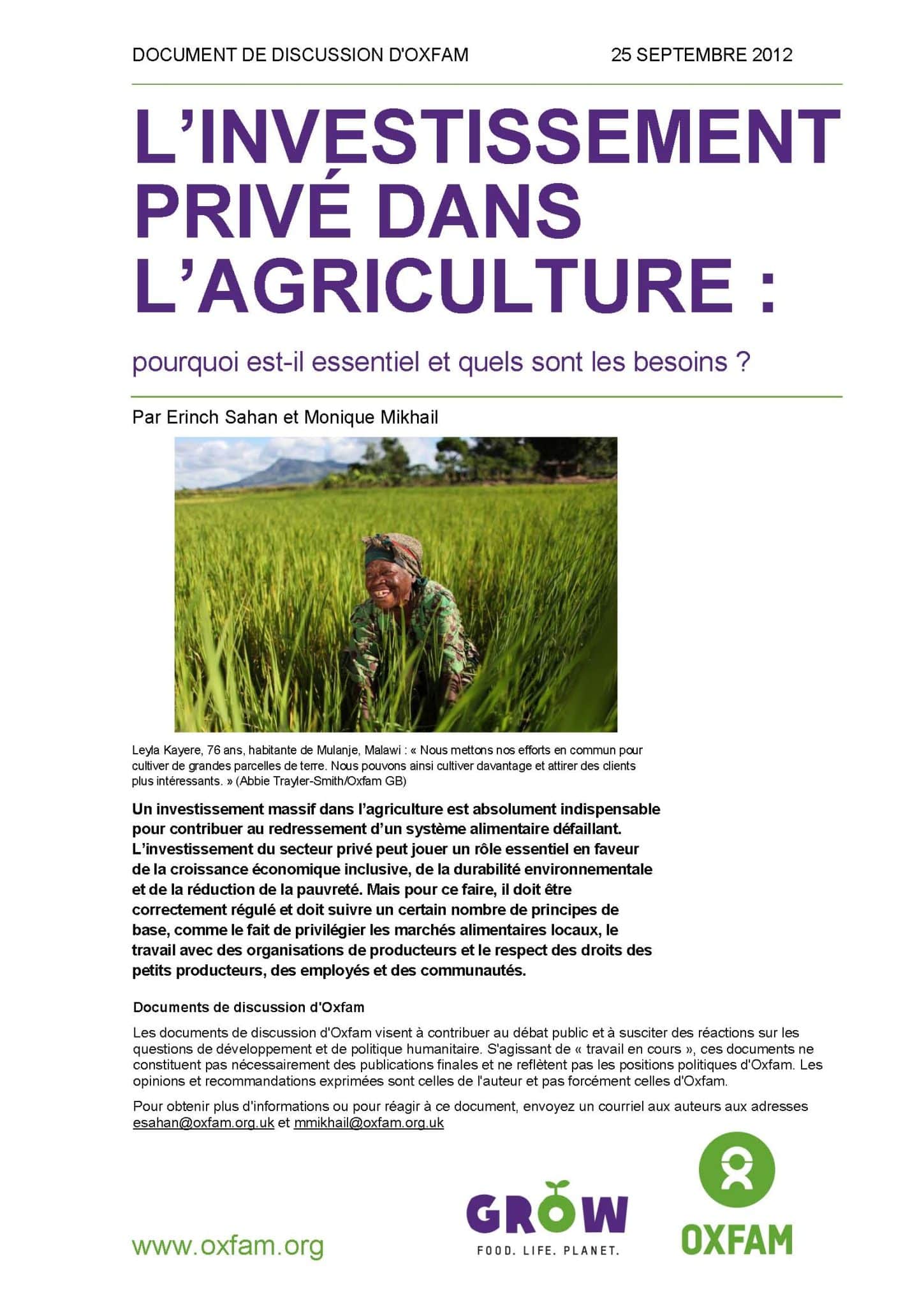 Pour lire le rapport : http://www.oxfam.org/fr/cultivons/policy/investissement-agriculture
