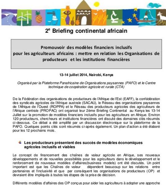 De la Fédération des organisations de producteurs de l’Afrique de l’Est (EAFF), la confédération des syndicats agricoles de l’Afrique australe (SACAU), le Réseau des organisations paysannes de l’Afrique de l’Ouest (ROPPA) et le Réseau des producteurs agricoles des agriculteurs de l’Afrique centrale (PROPAC) ont organisé leur 2ème Briefing Continental au Kenya les 13-14 Juillet sur la promotion de modèles financiers inclusifs pour les agriculteurs en Afrique. Environ 120 producteurs, chercheurs et institutions financières ont discuté des domaines clés résumés ci-dessous. Ce débat a été amplifié par un discussion électronique sur la plateforme de la PAFO. Quelques points clés sont résumés ci-après également. Un plan d’action a été élaboré pour les 12 prochains mois.
