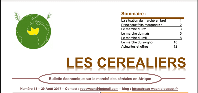 Retrouvez le bulletin N°13 « Les céréaliers » que propose le ROAC pour le mois d’Août 2017. Au cours de ce mois d’Août, globalement comme noté au mois précédent, les marchés sont restés bien approvisionnés. Aussi, les conditions climatiques ont permis d’assurer un développement végétatif acceptable des cultures céréalières. Les niveaux de prix pratiqués sont restés variables suivant les pays.