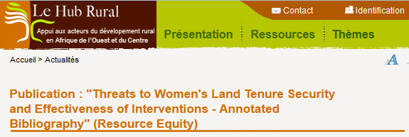 Cette bibliographie annotée concerne des documents identifiés dans le cadre d’une revue de la littérature sur la recherche existante sur les menaces qui pèsent sur la sécurité foncière des femmes et sur l’efficacité des interventions qui tentent de répondre à ces menaces. Ce travail se concentre seulement sur les menaces et les interventions de terrain relatives à l’insécurité foncière des femmes et ne traite ni de la portée du problème ni des avantages de garantir les droits fonciers des femmes. Vous trouverez le lien vers les documents sur le site du Hub Rural.